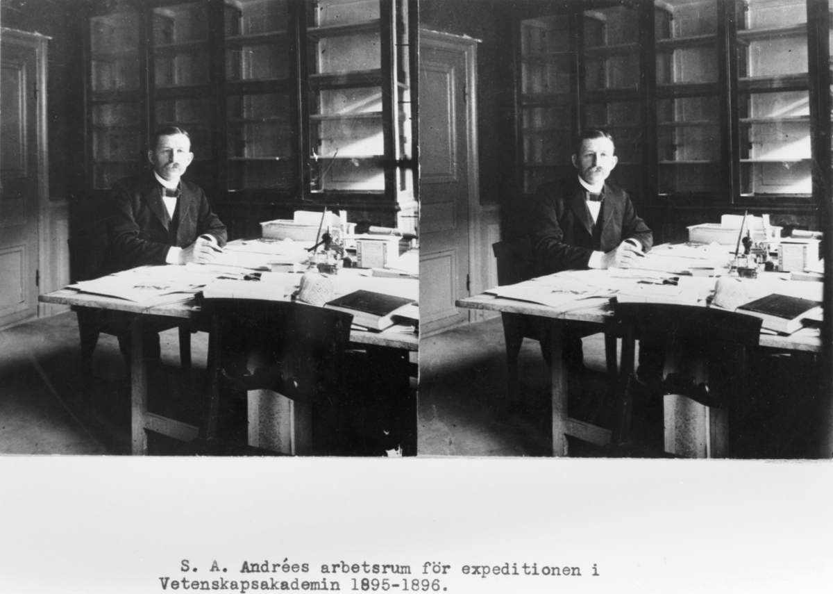 Stereobild. S.A. Andrées arbetsrum före expeditionen på Vetenskapsakademin 1895-1896.