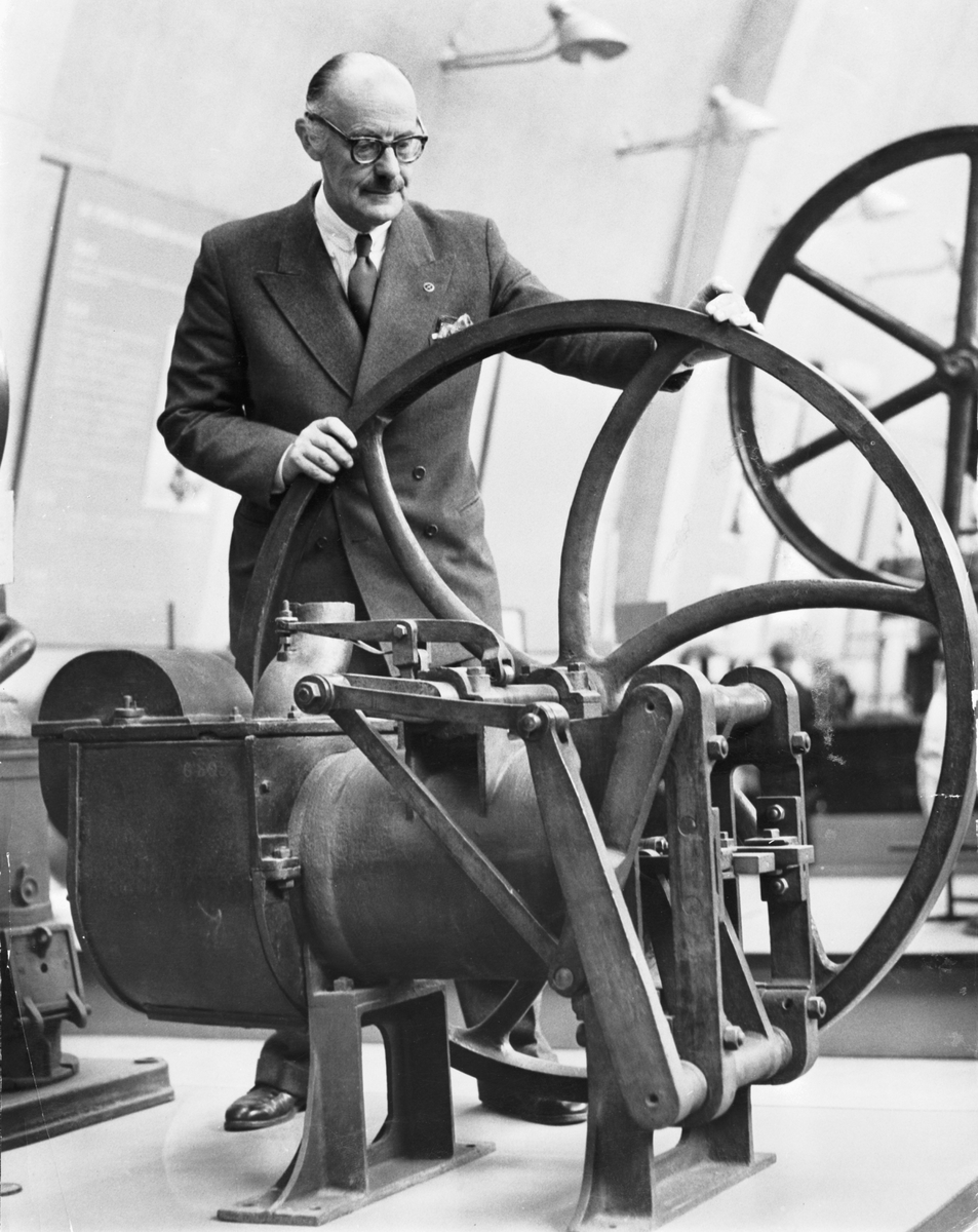 Maskinhallen. Torsten Althin bakom varmluftmotor tillverkad vid Åkers Styckebruk omkring 1879.
