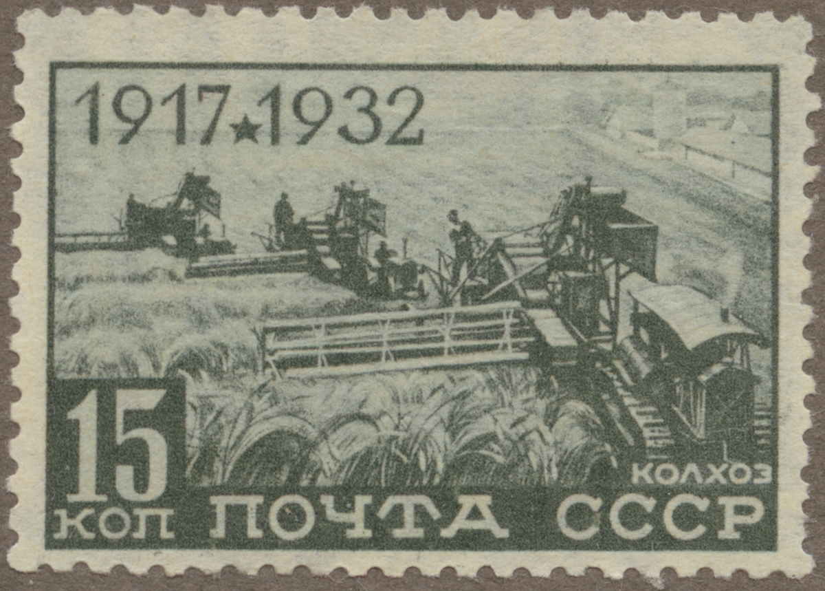 Frimärke från Ryssland, 1932. Motiv av Skördemaskin i Ryssland - 15-årsminne av Revolutionen av 1917-