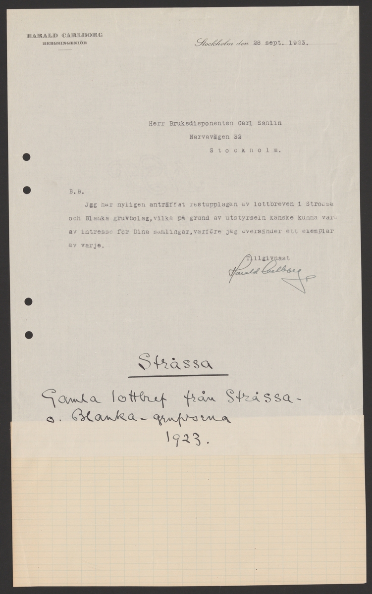 Titel: Stråssa gruvfälts kronologi. Stråssa gruva. Ur Carl Sahlins bergshistoriska samling.