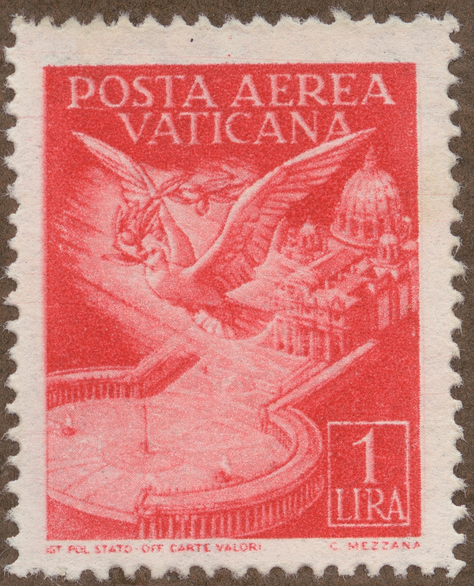 Frimärke från Vatikanen Italien, 1947. Motiv av Fredsduva med olivkvist över S:t Peters Domen "- Flygsymbol: Luftpost-"