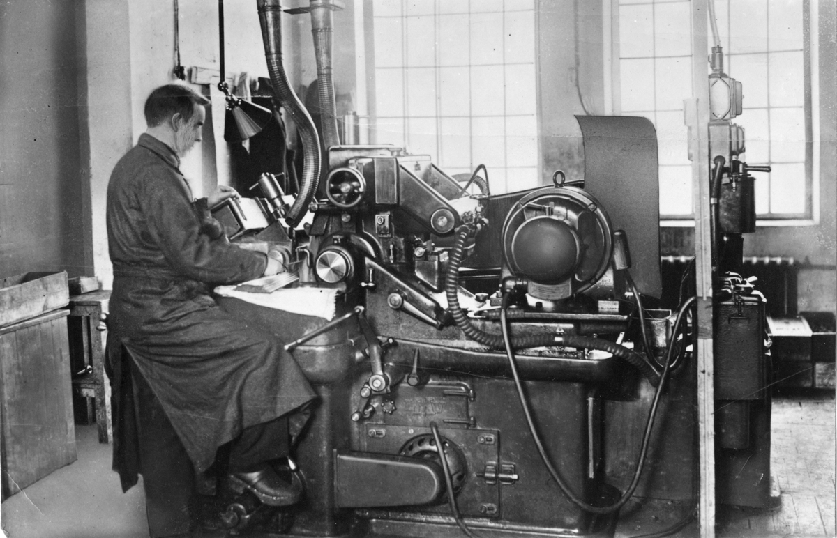 Husqvarna Vapenfabriks AB. Slipning av symaskinsaxel med tillåten tolerans av 5/1000 mm.