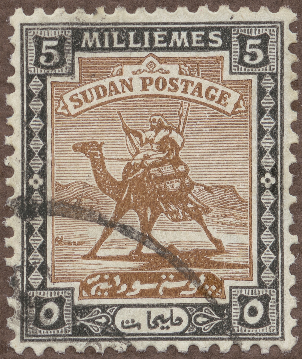 Frimärke ur Gösta Bodmans filatelistiska motivsamling, påbörjad 1950. Frimärke från Sudan, 1921. Motiv av Kamelryttare i Sudan