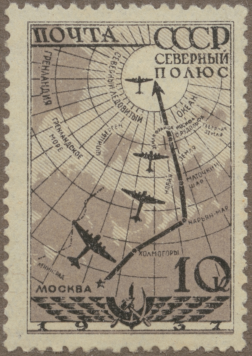 Frimärke från Ryssland, 1938. Motiv av Karta över rysk Nordpolsflygning från Moskwa, sommaren 1937 "Företogs i flygmaskinen ANT 25 med bl.a. de ryska flygarna Tsjkalov, Bajdukov och Beljakov ombord.-"