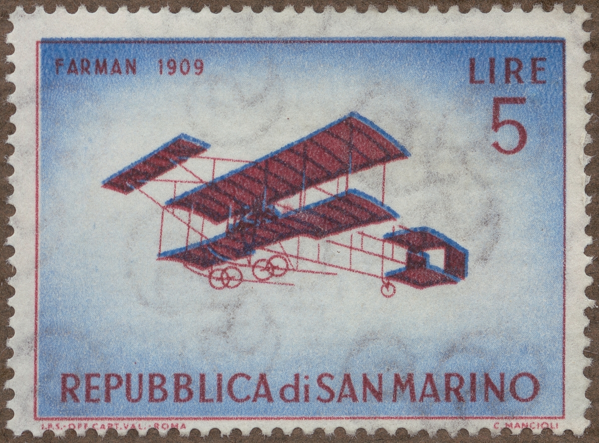 Frimärke från San Marino, 1962. Motiv av Henri Farman: 1909 "f. 1874- d.1958 Fransk pilot och flygplansfabrikant." "Serie: Äldre flygplanstyper"