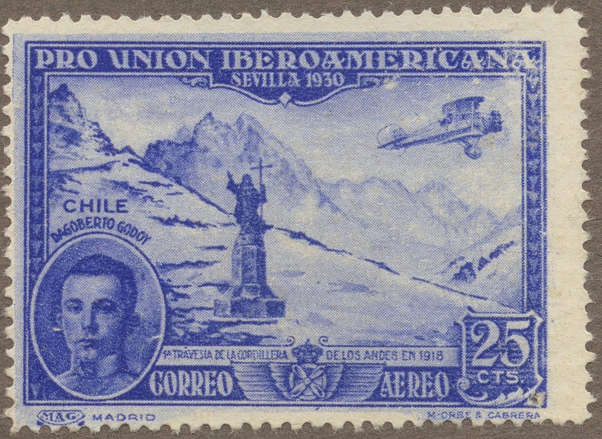 Frimärke från Spanien, 1930. Motiv av Dagoberto Godoy och hans flygplan: Första flygningen över Anderna, Argentina- Chile 1918. "(-Minne om Sevilla utställningen 1930)"