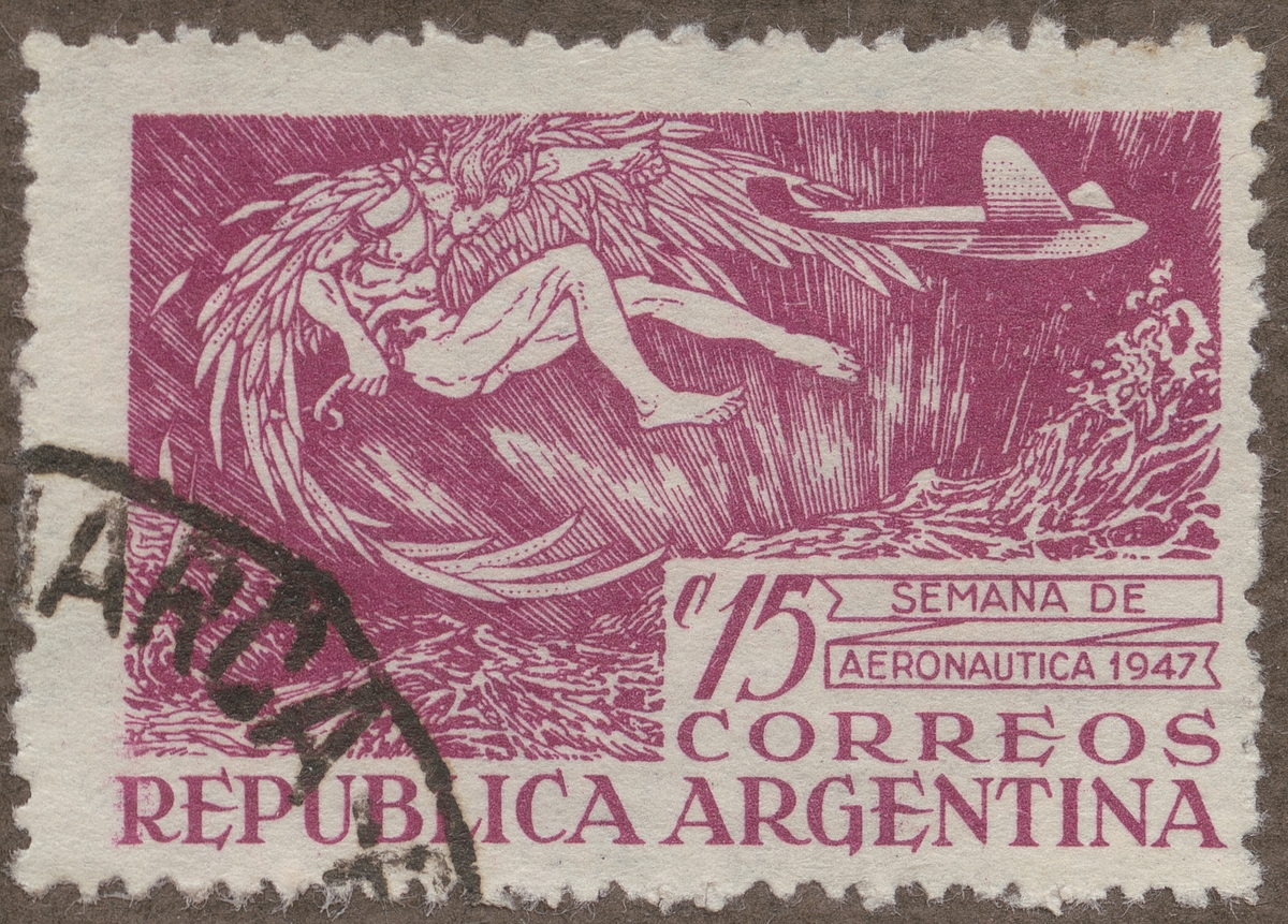 Frimärke från Argentina, 1947. Motiv av Den störtande Ikaros och ett Rea-plan "Flygvecka"