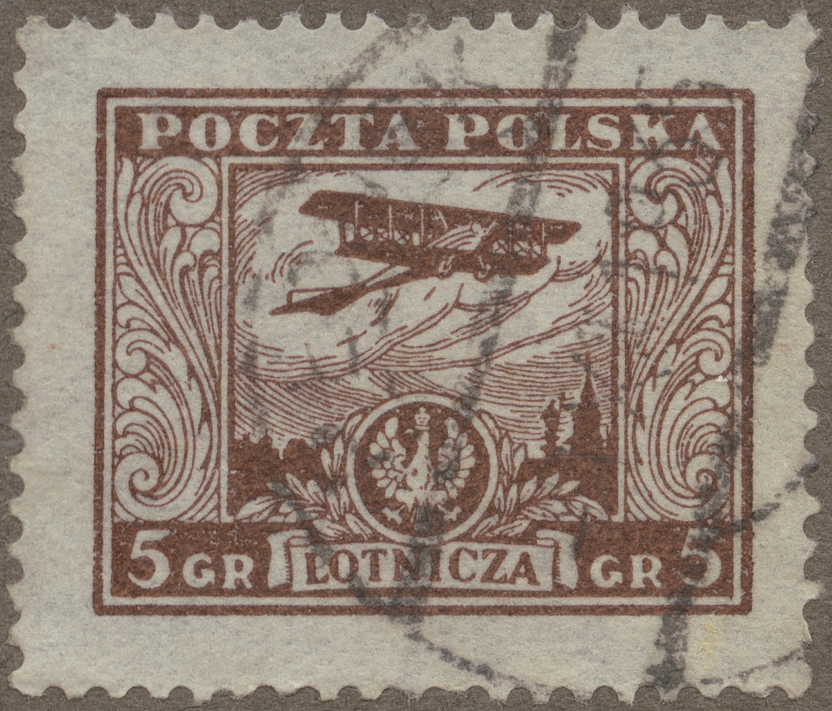 Frimärke från Polen, 1925. Motiv av Polsk flygmaskin, tvådäckare. Flygpost.