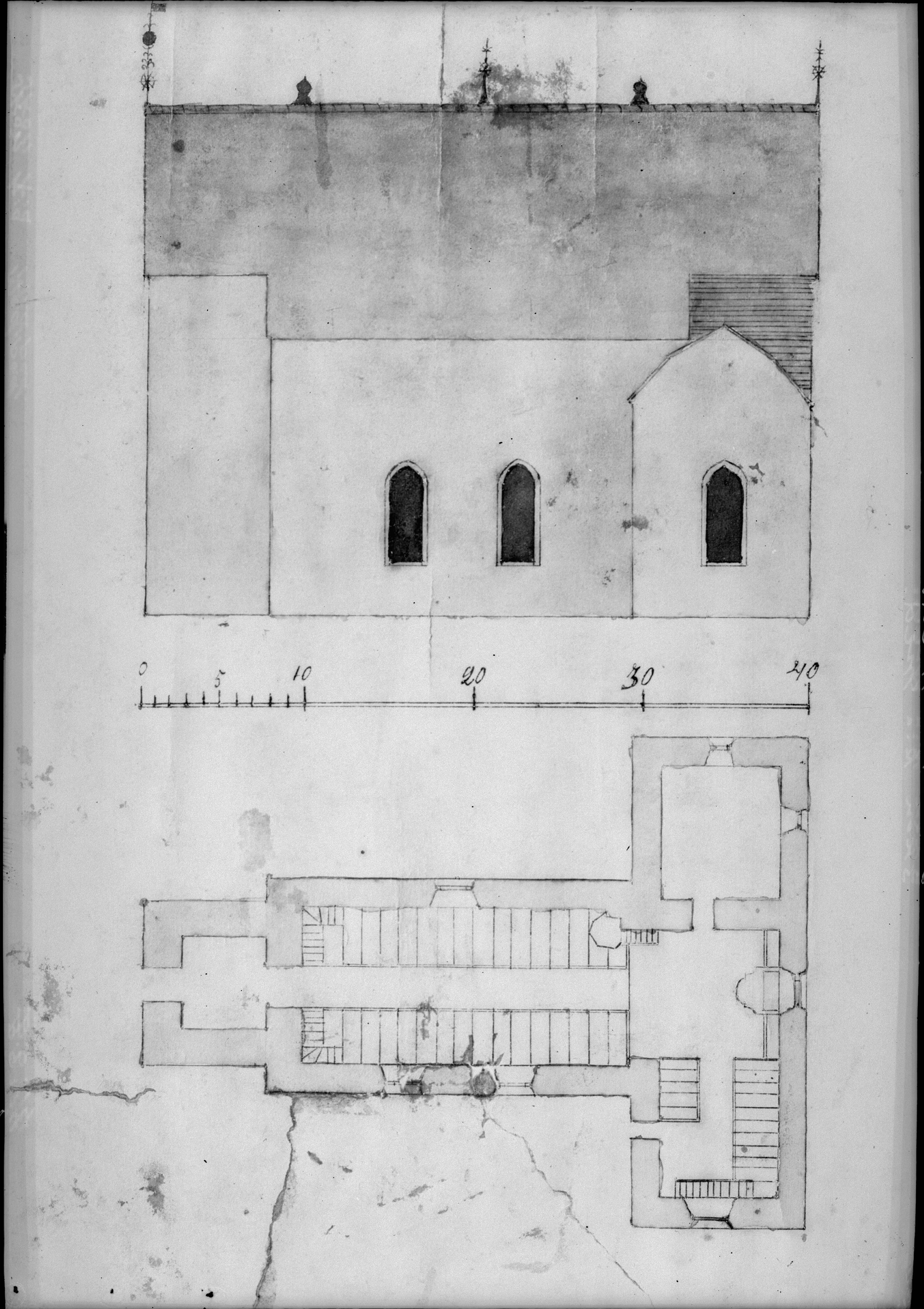 Foto av ritning av plan och sydfasad enligt uppmätning 1846.
