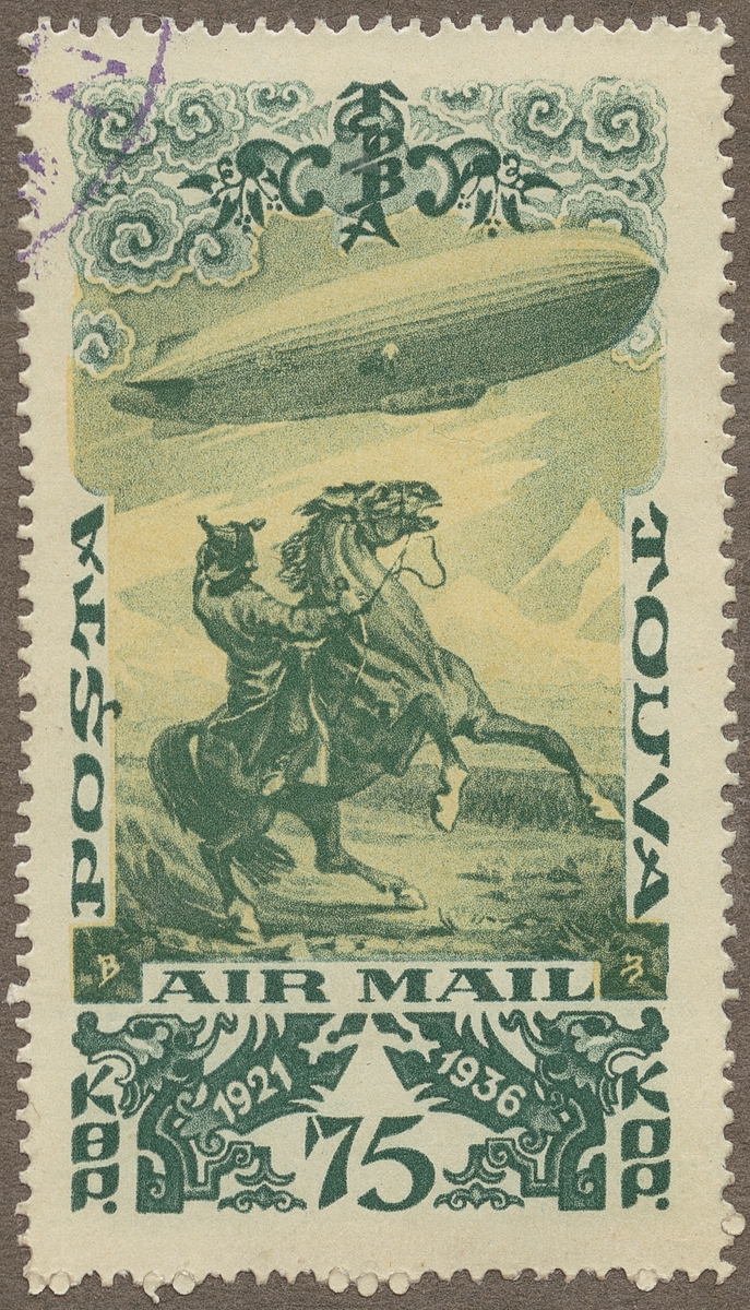 Frimärke från Touva, Mongoliet, 1936. Motiv av Luftskepp och ryttare "15-årsjubileum av autonoma republiken Touva:s tillblivelse. 1921-1936."
