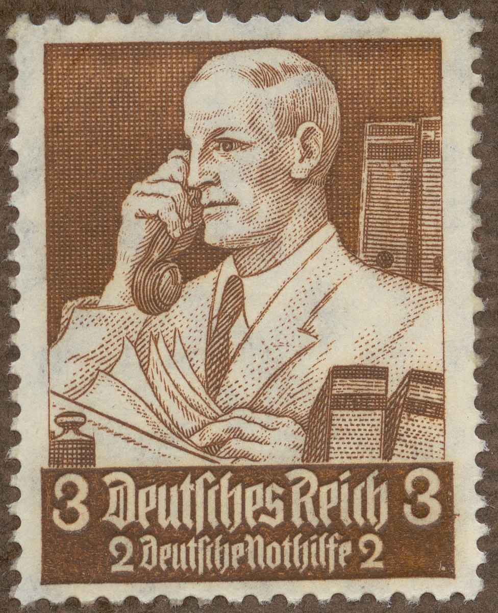 Frimärke ur Gösta Bodmans filatelistiska motivsamling, påbörjad 1950. Frimärke från Tyskland, 1943. Motiv av Affärsman med telefon