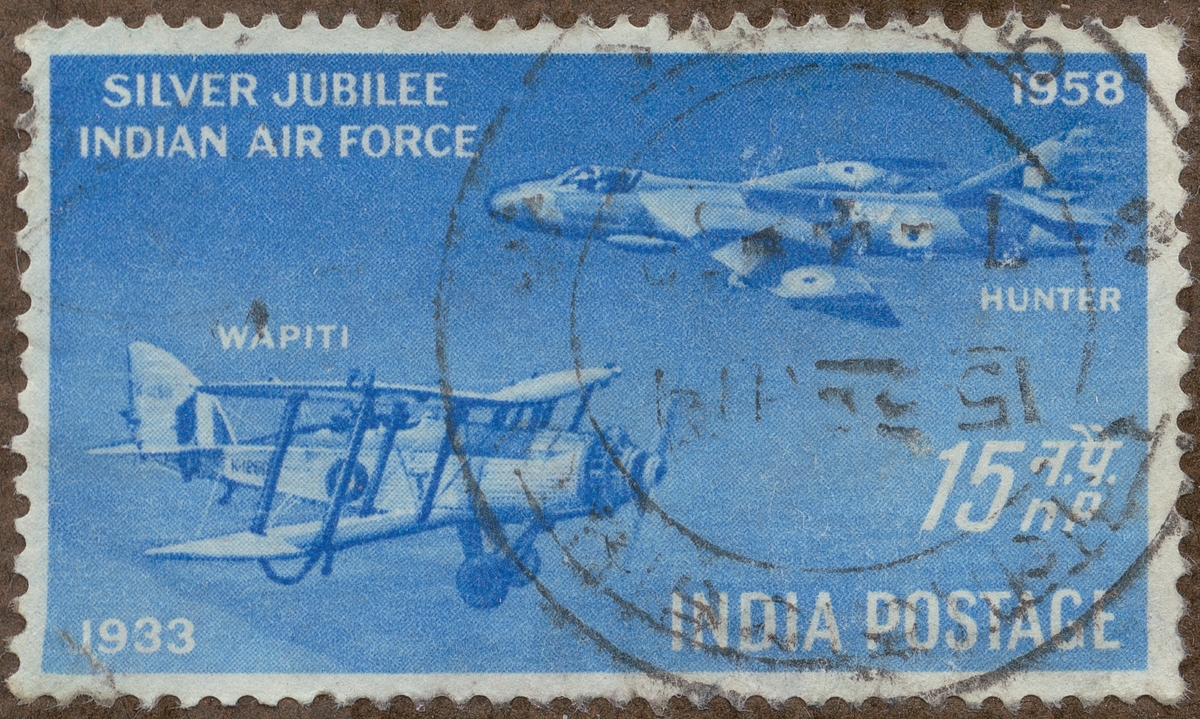 Frimärke från Indien, 1958. Motiv av Biplan: "Wapiti" Monoplan "Hunter" "25-års jubileum av indiska luftvapnet: "Indian Air Force 1933-1958""