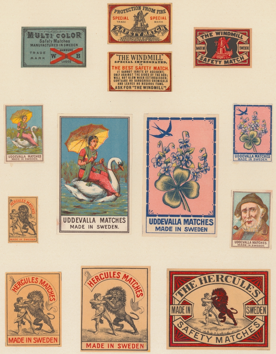 Etiketter för tändsticksaskar, från Svenskt Industri- och Handelsmuseum.
