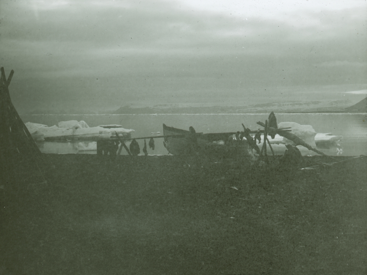 Fotografi från expedition till Spetsbergen. Motiv av strand med båt, isberg och fisk som hänger på tork.