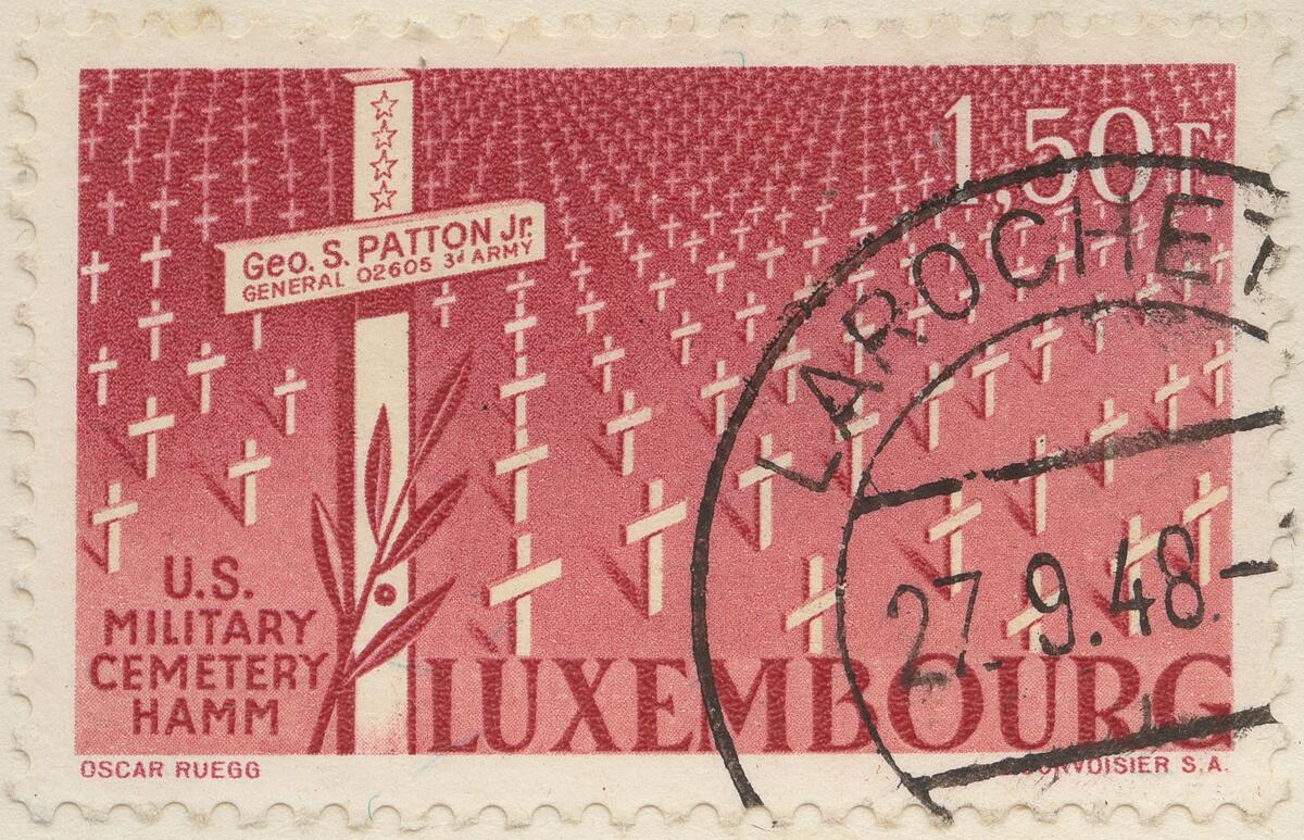 Frimärke från Luxemburg, 1947. Motiv av Amerikansk Krigskyrkogård i Hamn, Luxemburg med (i förgrunden): General George S. Patton, Jr:s grav. -Gen. Patton ledde stridsvagnarna vid Tysklands erövring 1945-