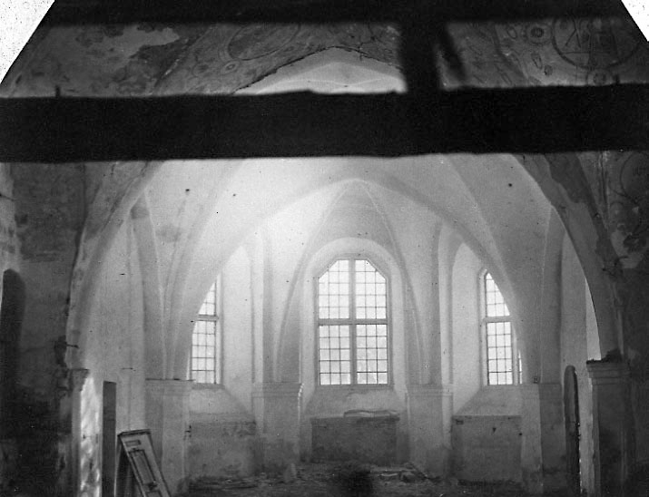 Den romanska stenkyrkan, riven 1877, hade kalkmålningar från 1400-talet, troligen utförda av Amund, och ett skulptursmyckat gravkor för adelssläkten Ribbing från 1646. Detta finns ännu kvar på ödekyrkogården.