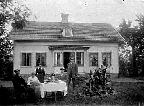 Två kvinnor och tre män vid kaffebordet i trädgården.