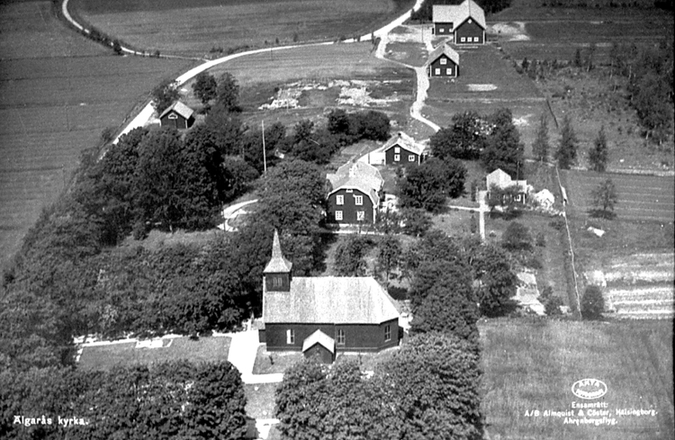 Flygbild över Älgarås med kyrkan i förgrunden.