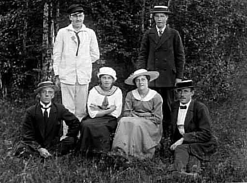 TRE KVINNOR OCH TRE MÄN SITTER I GRÄSET