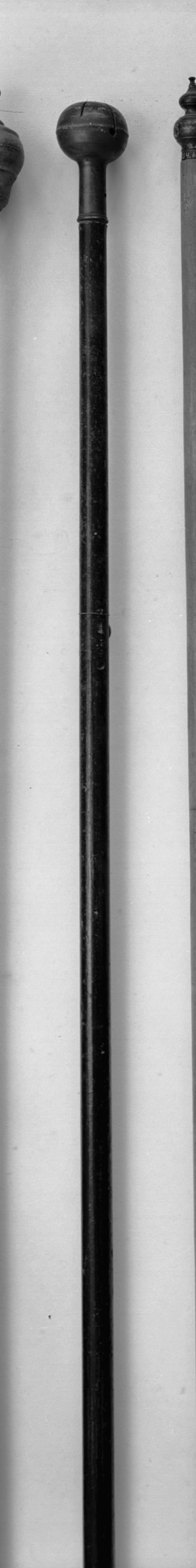 Kyrkstöt med träskaft, järnbeslagen, mässingsbjällra.
