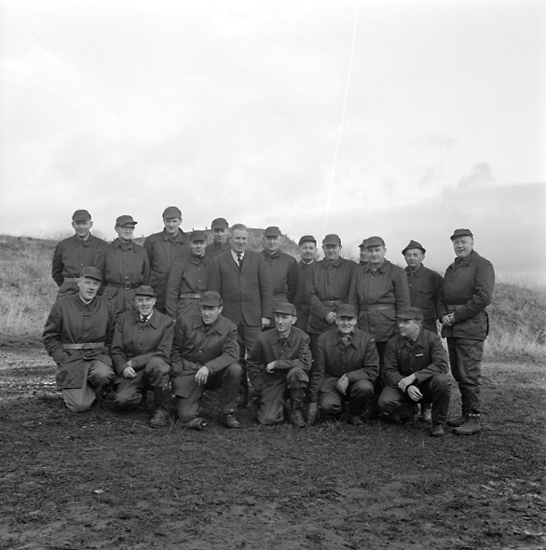Civilförsvarare, med många skarabor. 1962. Civilklädd chef poliskommissarie Folke Ericsson.
