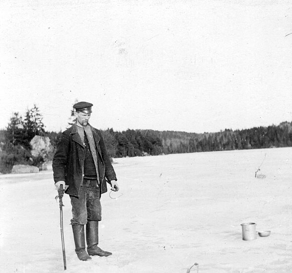 Vinterfiskare. Gäddfiske vid isvak med ståndkrok som agnas med mört.