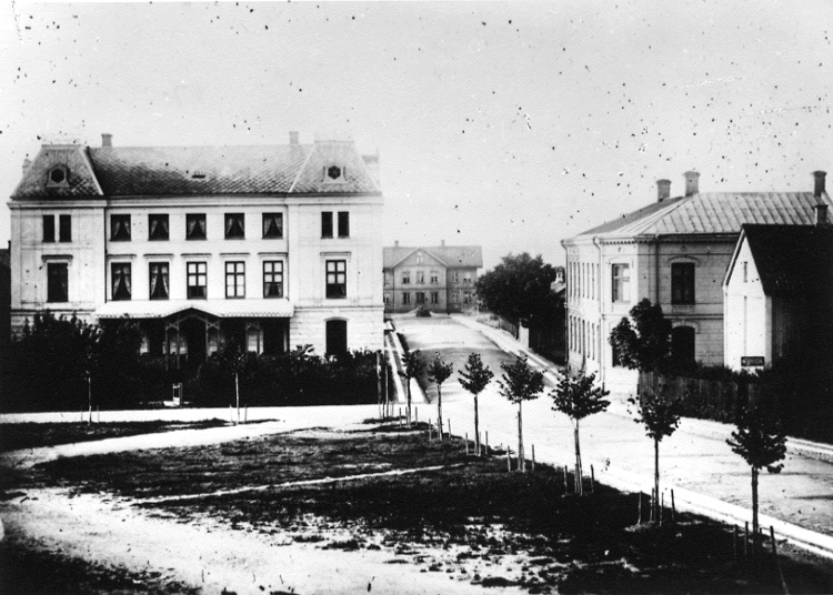 Järnvägsgatan med stationshuset i fonden. Fotografi från tidigt 1890-tal.