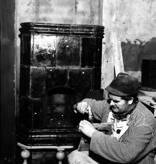 Kakelugnsmakaren Hjoberg från Frändefors, sätter upp kakelugn i biblioteket.