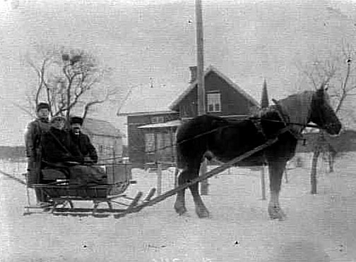 TRE MÄN I EN SLÄDE PÅ LANDSVÄGEN VID BÖCKERSBODA I LYRESTAD, ANSPÄND MED EN HÄST.