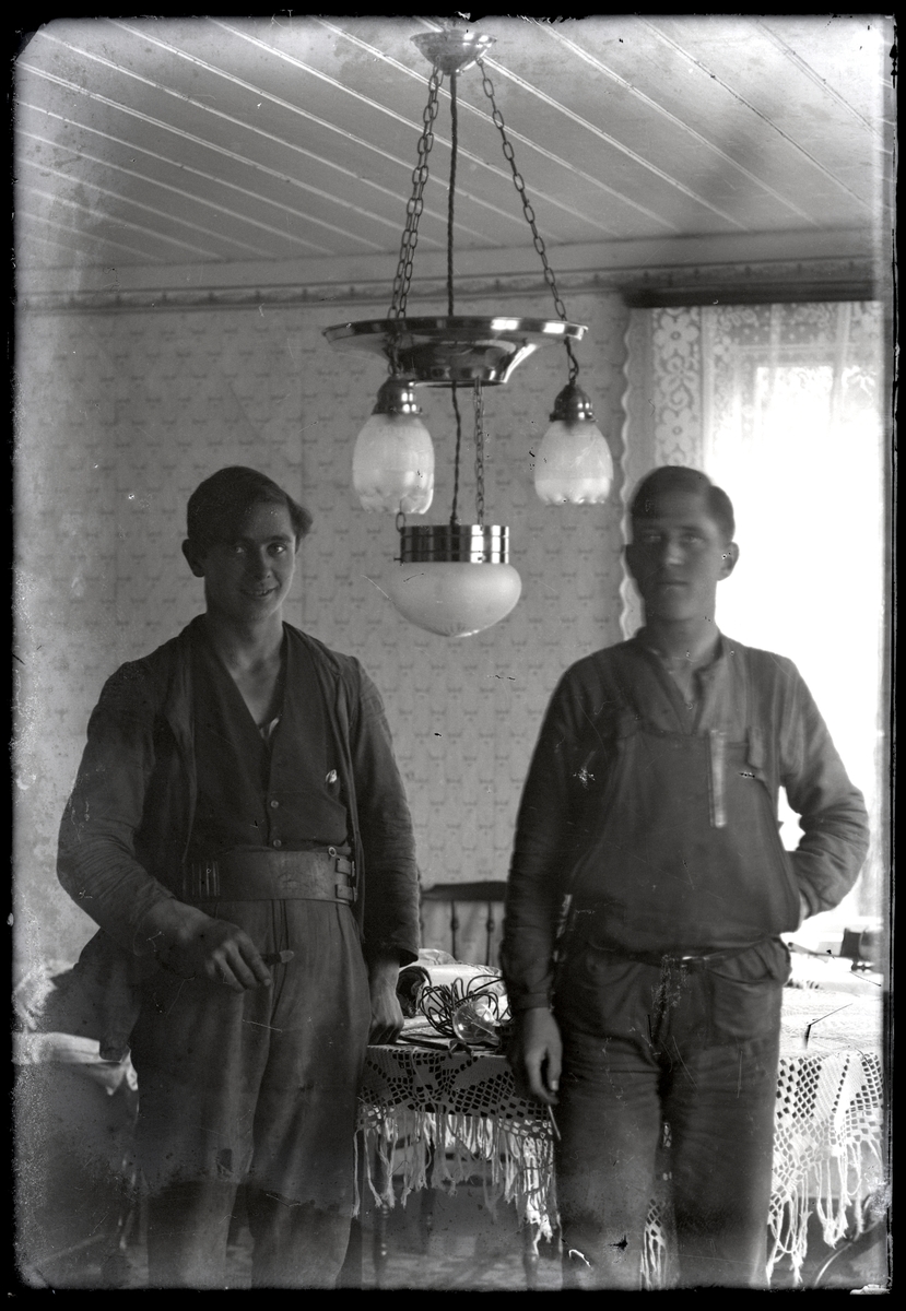 Två unga män under den första elektriska taklampan