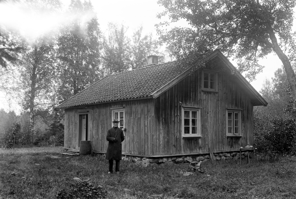 Bokbindare L.P. Mattsson i Täng framför sin stuga