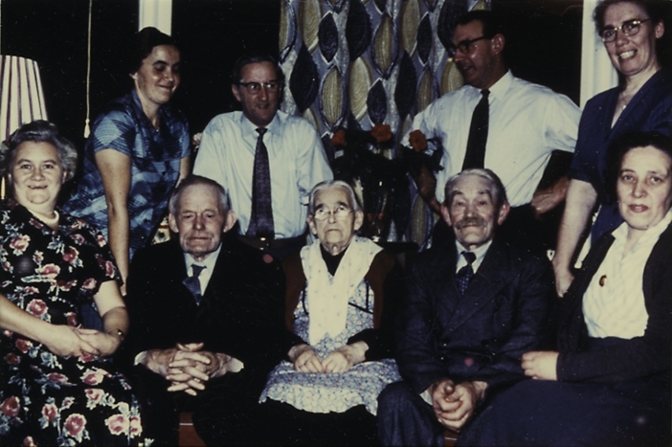 Tilda Gustavsson sittande i mitten, Lars far Erik Gustavsson till höger om Tilda, nere till vänster Otto Gustavsson, mjölnare i Varnhem, Elsa Eriksson längst ner till höger.