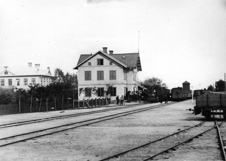 På bilden återfinns två tågset, ett mot Stenstorp och ett mot Lidköping. Loken är de första L.S.S.J. (Lidköping-Skara-Stenstorps Jernväg) inköpte hos Kristinehamns mek. verkstad 1873 och betingade ett pris av 24000 å 24500 riksdaler per styck. Fotografi från 1878.