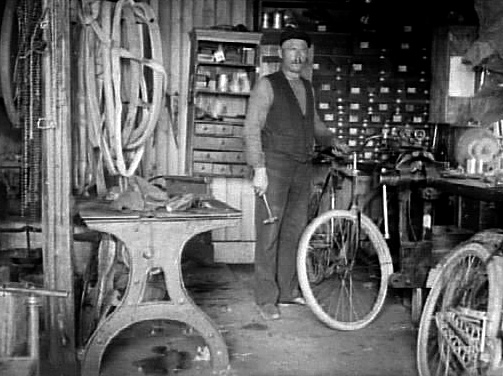 EN CYKELREPARATÖR I SIN VERKSTAD.