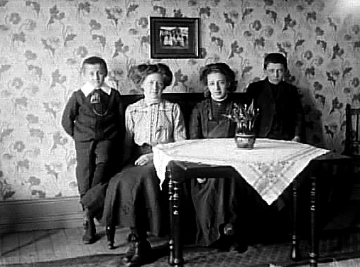 TVÅ KVINNOR OCH TVÅ POJKAR SITTER I SOFFAN I RUMMET.