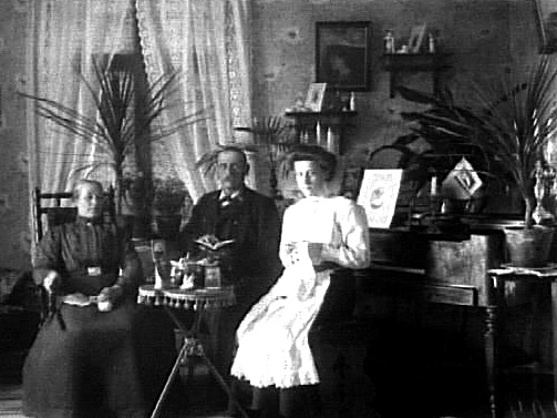 TVÅ KVINNOR SITTER OCH HANDARBETAR, MELLAN DEM SITTER EN MAN OCH LÄSER.