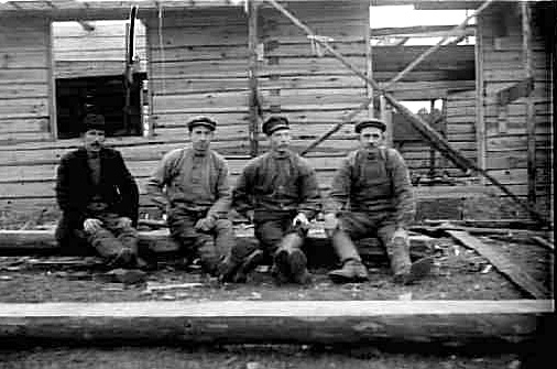 BYGGMÄSTARE KARLSSON OCH TRE MEDARBETARE FRAMFÖR ETT BYGGE