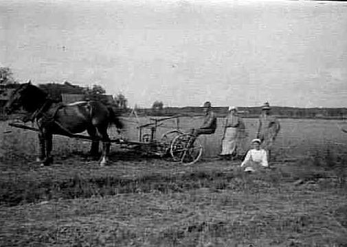 EN MAN KÖR EN SLÅTTERMASKIN MED ETT PAR HÄSTAR, MED EXTRA PÅMONTERAD HASPEL FÖR ATT UNDERLÄTTA SLÅTTERN.