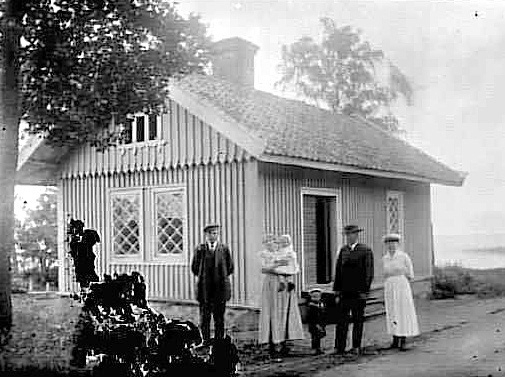 EN FAMILJ FRAMFÖR GRINDSTUGAN VID SÄTRA. I BAKGRUNDEN SJÖN VIKEN.
