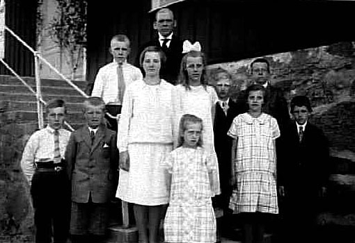 LÄRARE GÖSTA HULTGREN MED SIN KLASS PÅ SKOLANS TRAPPA.