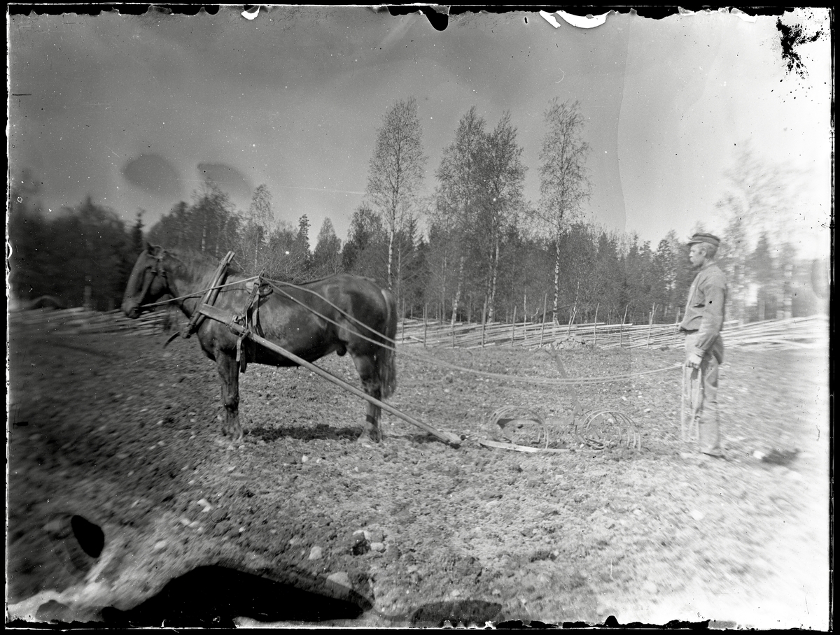Jordbruksarbete med häst och harv