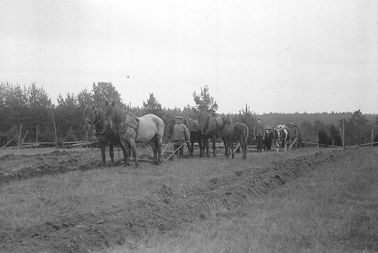BÖNDER UTE OCH PLÖJER MED TVÅ PAR HÄSTAR OCH ETT PAR OXAR.