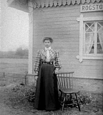EN KVINNA VID VÄGGEN TILL BROVAKTARSTUGAN VID ROGSTORP.