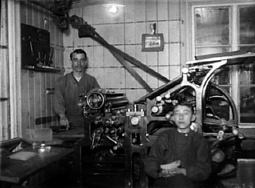 TVÅ MÄN INNE I ETT TRYCKERI SOM STÅR VID EN TRYCKPRESS