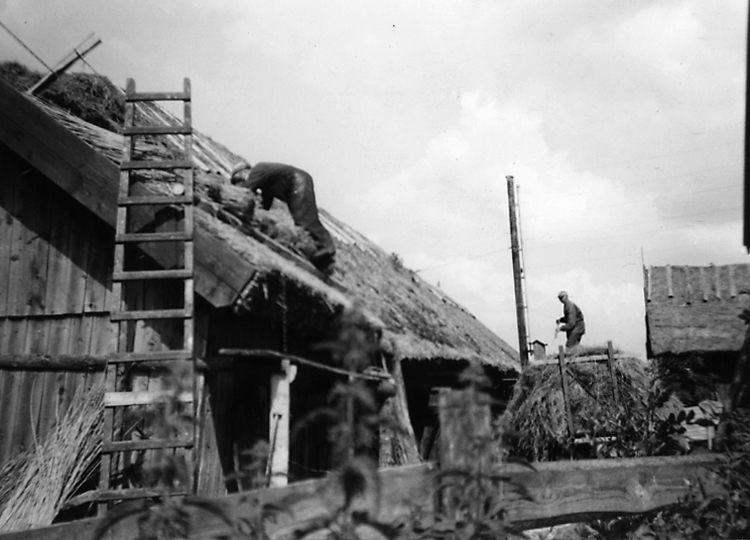 Eber Nilsson, arrendator och Lars Eriksson, omläggning av taket på ladugården 1960-talet.