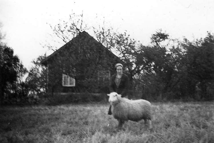 Elsa Eriksson och en fårtacka utanför Heljesgården 1940-talet.