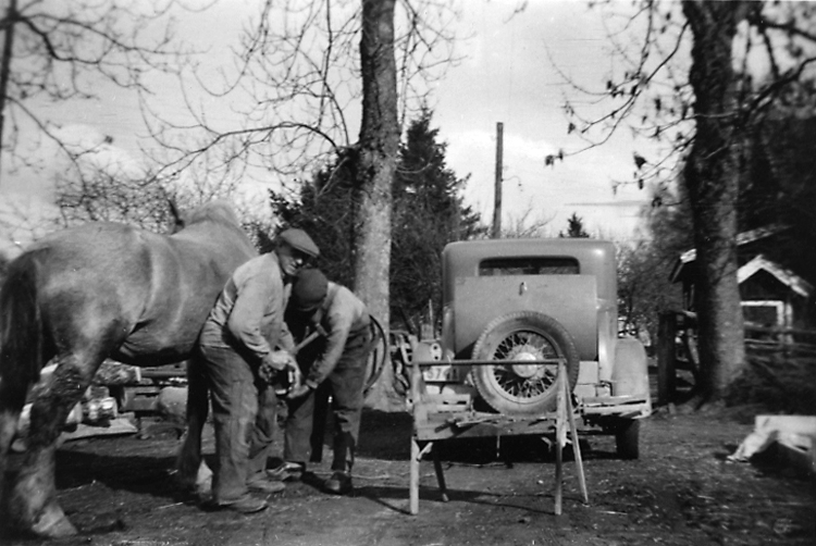 Smeden/hovslagare Folke Jönsson, Hornborga, skor hästen Docka på Heljesgården.