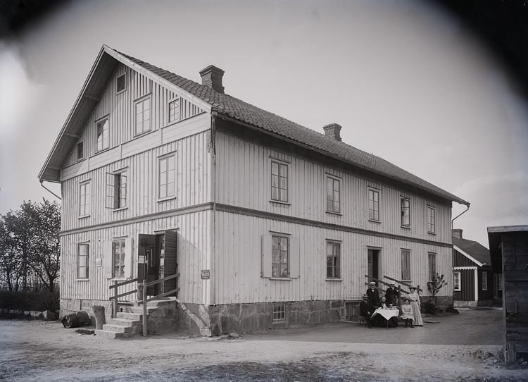 Familjen L.A. Andersson vid kaffebord utanför affären/bostaden 1907.