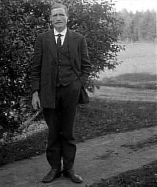 Bilden är tagen vid knuten av torpstugan på gården Nyborg i Enåsa socken. Albin var i sin ungdom rallare och var med och byggde västgötabanan. Han hade tre syskon: Ivar som emigrerade till Amerika 1897, Sofia som gifte sig med Anton Andersson i Eken i Hassle församling och Anna som arbetade i olika mejerier i sin ungdom. När föräldrarna blev gamla och orkeslösa flyttade Anna hem och hjälpte till på gården. Vid faderns frånfälle tog Albin över gården och drev den tillsammans med syster Anna till 1950 då han sålde gården till David Andersson i Enåsa Sörgården. De sista aktiva åren före pensionen arbetade Albin som lantarbetare på Fålebergs gård. Albins syster Anna dog 1968. Då flyttade Albin till äldreboendet i Hasslerör där han bodde till sin död 1976. Han och systern ligger begravda på Enåsa kyrkogård.