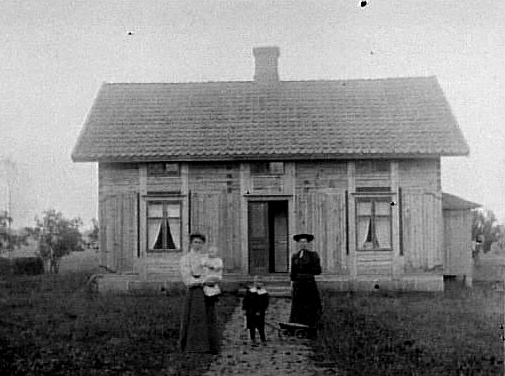 TVÅ KVINNOR MED BARN FRAMFÖR ETT HUS